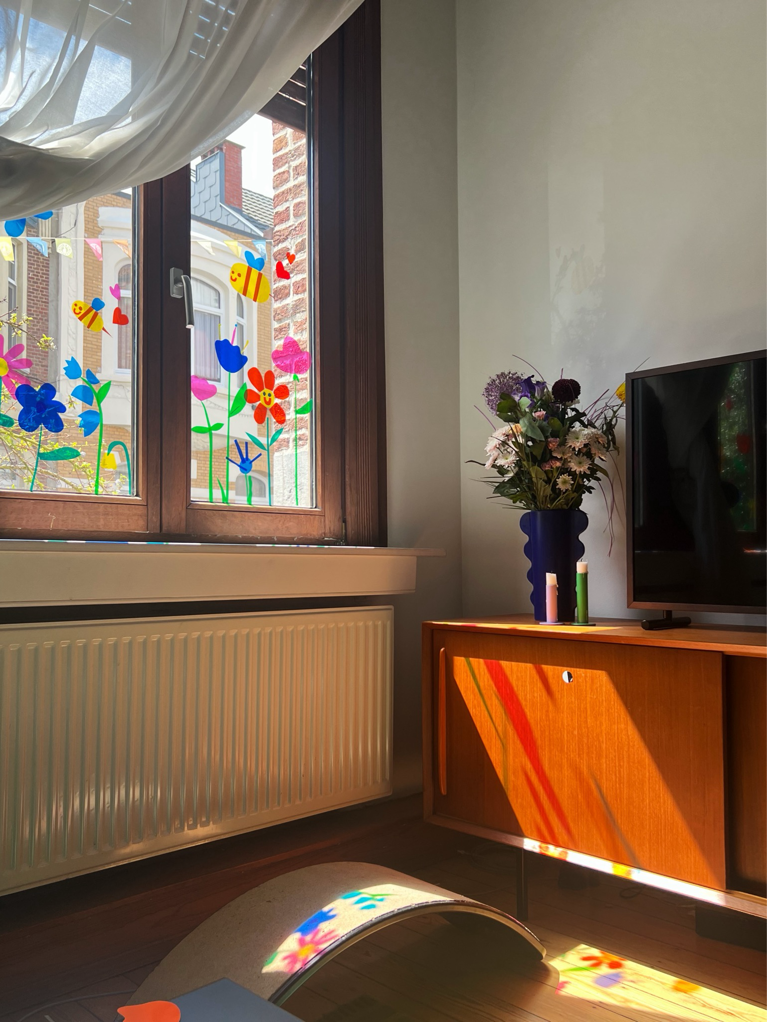 De kleurrijke, zelfklevende raamfolie kan je zonder lijm aanbrengen en hergebruiken. Hij kleeft niet alleen aan vensters, maar ook andere gladde oppervlakken.