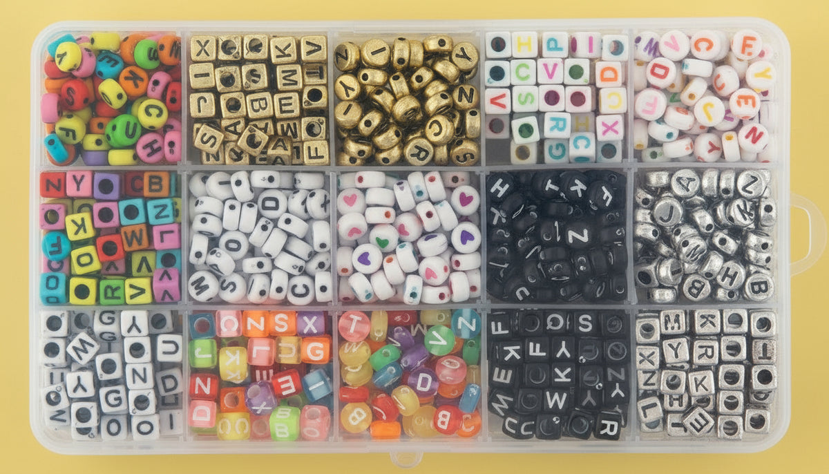 In deze set zitten 15 verschillende soorten letterkralen, netjes gesorteerd in een handig opbergdoosje. Perfect voor het maken van armbanden, sleutelhangers of andere creatieve projectjes