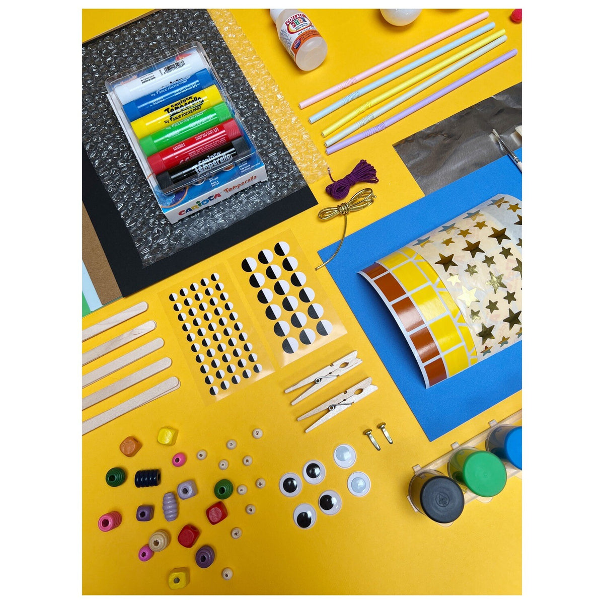 gekleurd papier, rubber, bubbelwrap, stickers, parels, pompons, lollystokjes, elastiek, touw, splitpennen, wiebeloogjes, rietjes, isomo-bollen, satéstokjes, wasknijpers en meer -