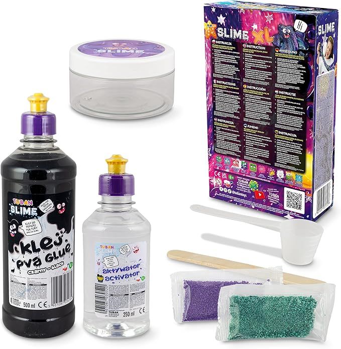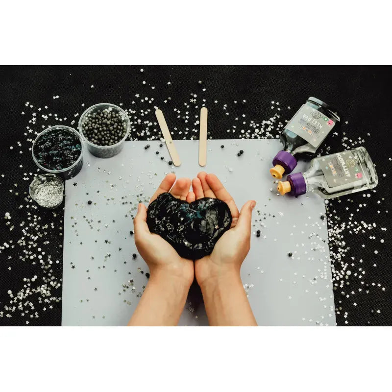 Laat kinderen hun eigen sterrenstelsel maken met deze betoverende DIY Galaxy Slime Kit! Deze knutselset bevat alles wat je nodig hebt om donker, glanzend slijm te maken dat sprankelt als de nacht: zwarte PVA-lijm, een activator en neon glitters zonder microplastics.