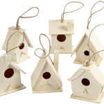 Een klein houten vogelhuisje met een lusje. Leuk om te verven en te hangen in je paasboom, op te hangen op je kamer of knip het lusje eraf en gebruik ze om een leuke sprookjestuin te knutselen.
