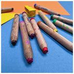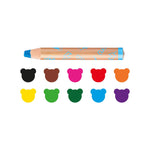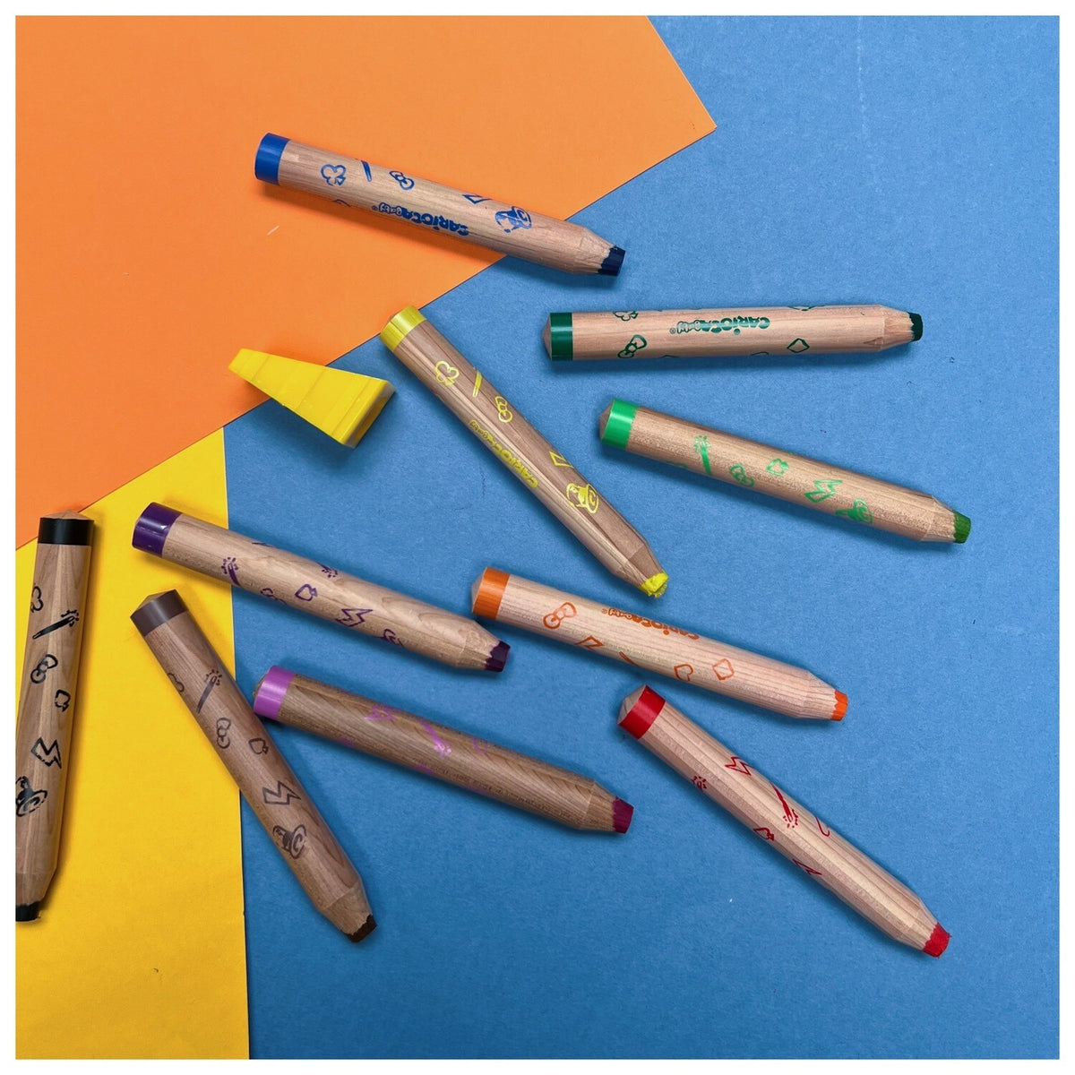 Deze set van 10 dikke potloden ( met slijper) is ideaal voor kleine knutselaars vanaf 1 jaar. Elk potlood is een 3-in-1 crayon: potlood, wasco en waterverf in één!