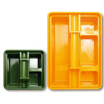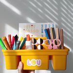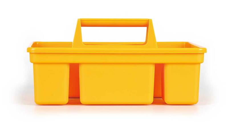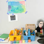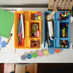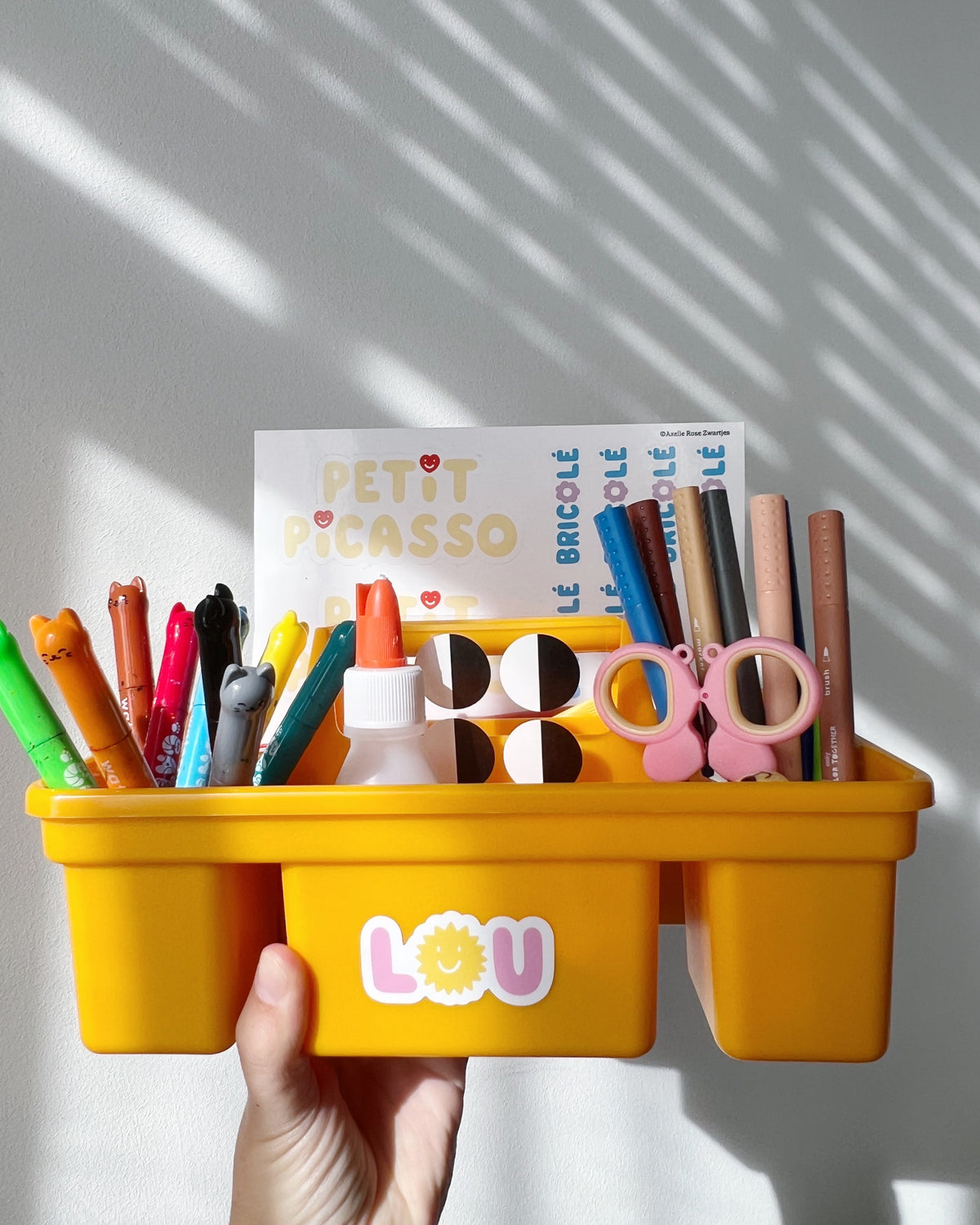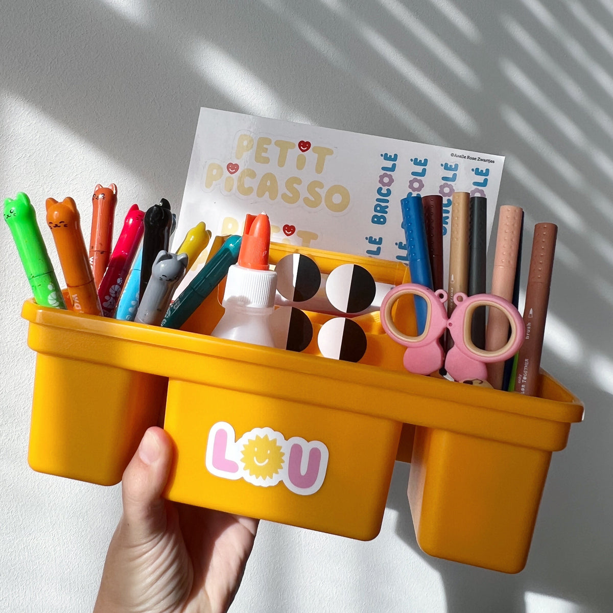 Met dit handige opbergbakje met handvat houd je al het knutselmateriaal netjes georganiseerd. De vier vakken bieden plek voor stiften, kleurtjes, lijm en scharen, alles binnen handbereik voor kleine en grote kunstenaars.