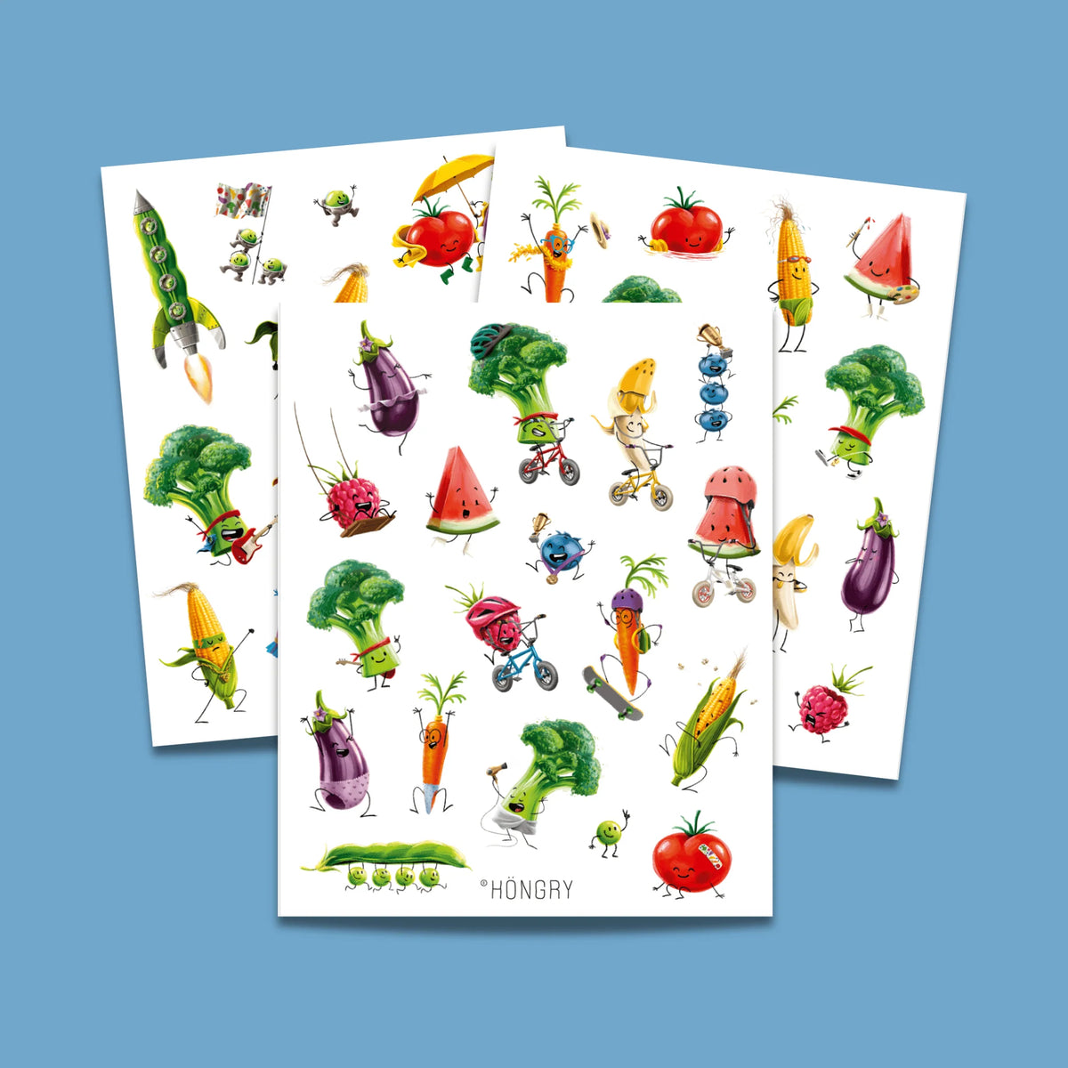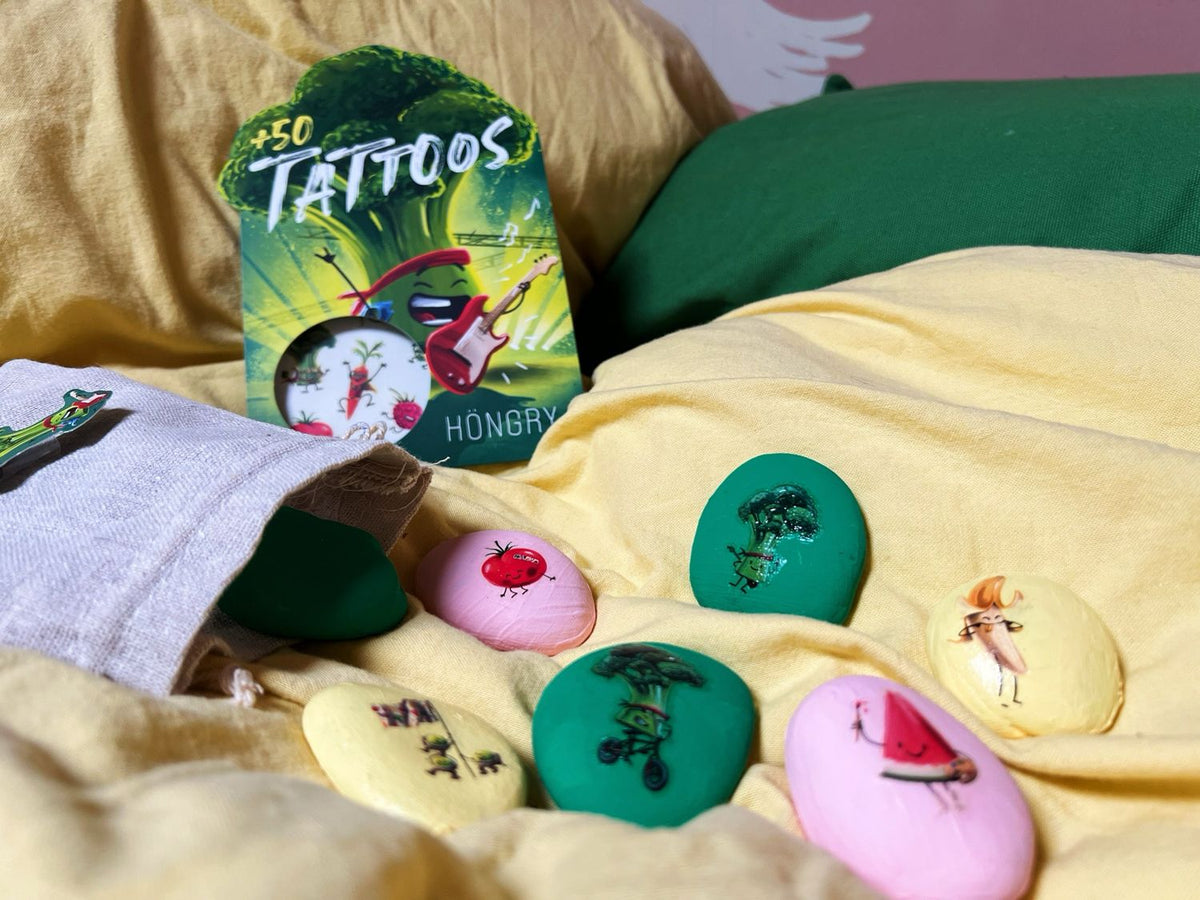 Een zingende broccoli op je arm? Een skatende wortel op je enkel? Of een framBOOS op je buik? Met deze vrolijke Hongry plaktattoos kan het allemaal!