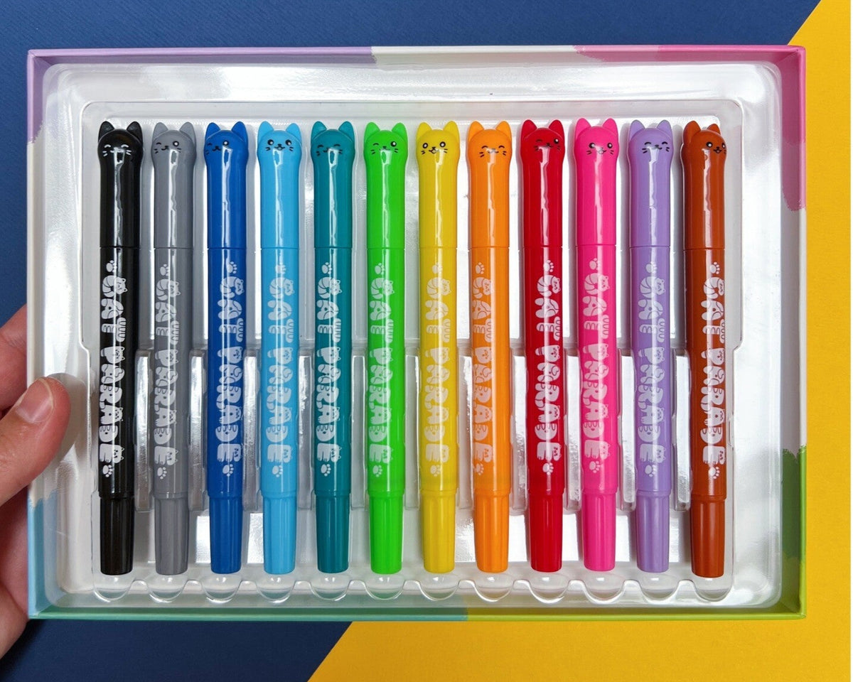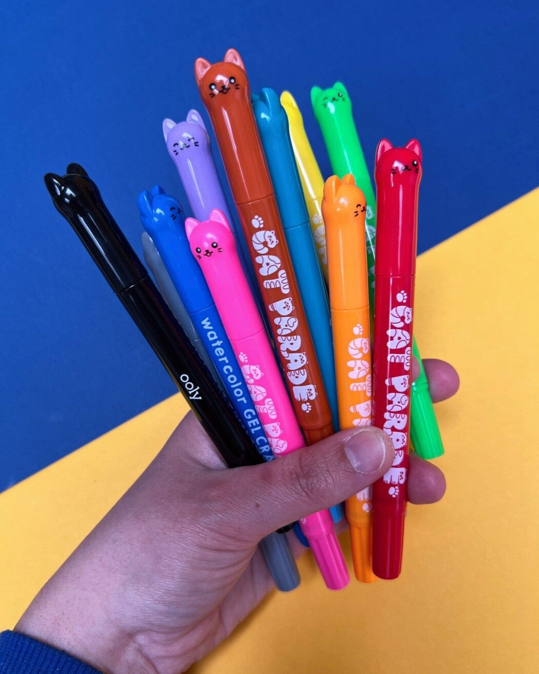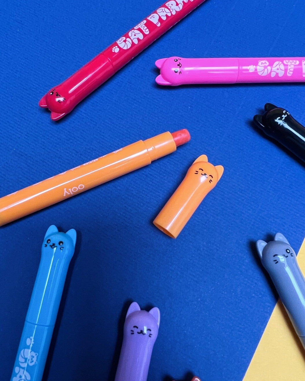 Ik was instant verliefd op deze schattige catparade gelkrijtjes. Ze zijn gewoon purrrrr-fect! De wasco-stiften zien er niet alleen superleuk uit, maar zijn ook heerlijk om mee te tekenen. Draai het krijtje omhoog en aan de slag!
