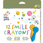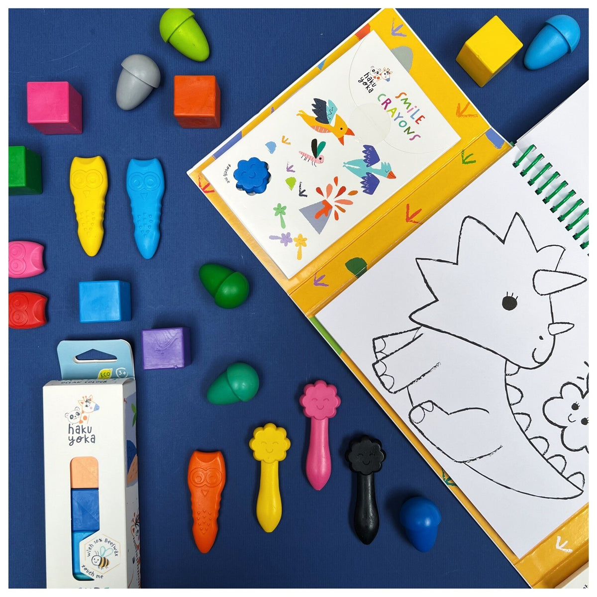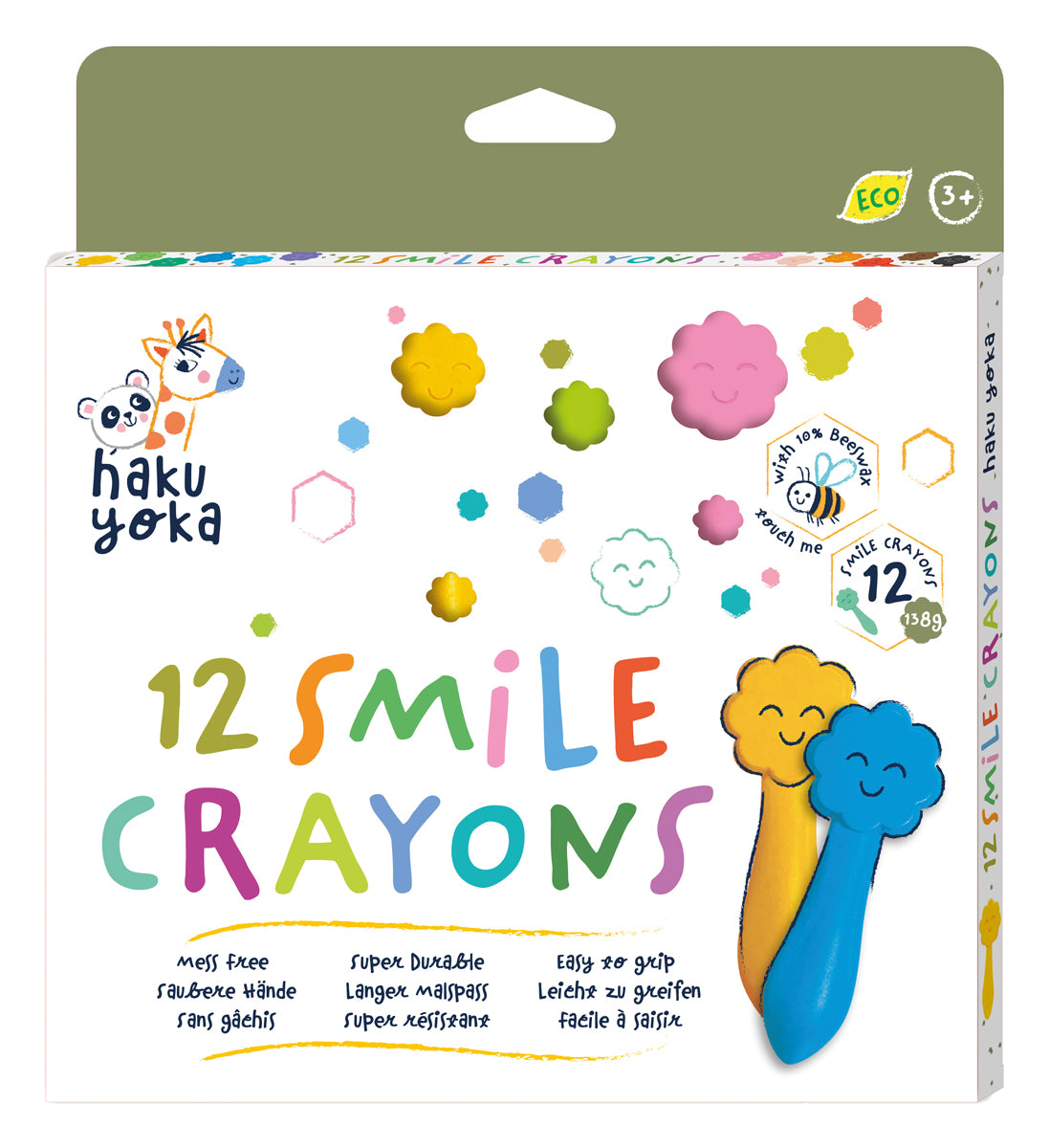 De HAKU YOKA krijtjes hebben de vorm van een bloem met een grote smile op hun gezicht.