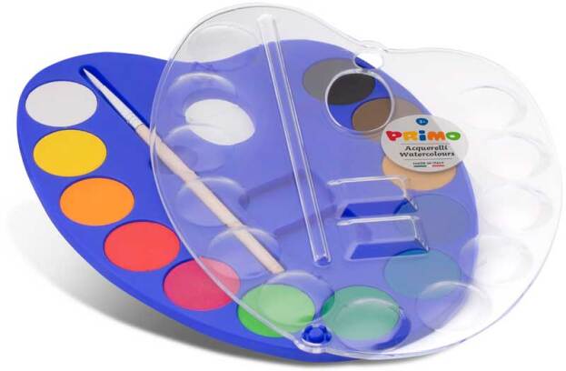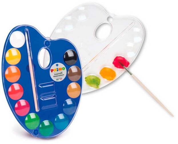 Dit waterverfpallet van Primo bevat 12 prachtige kleuren, een mengdeksel en een houten penseeltje. De verf is geschikt voor zowel papier als karton. Een groot pluspunt: er zitten meerdere huidskleuren in het pallet, ideaal voor het schilderen van mensen en portretten.