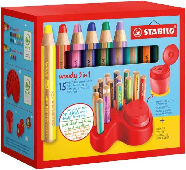 Stimuleer de creativiteit van je kind met de Woody 3-in-1 kleurpotlodenset! Deze complete set bevat 15 Woody 3-in-1 kleurpotloden, een handig opbergbakje en een grote puntenslijper met reservoir, speciaal geschikt voor de dikke Woody potloden.
