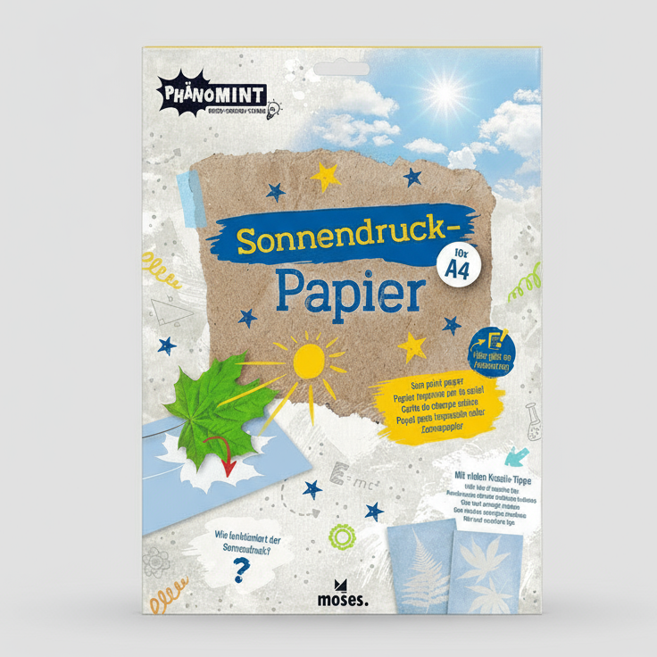 Met dit zonneprint papier (ook wel cyanotype papier genoemd) maak je snel en eenvoudig creatieve prints. Het papier is voorzien van een ijzerhoudende laag. Zodra het in contact komt met zonlicht, wordt het ijzerpoeder omgezet in kleurstof. Hierdoor verschijnt de vorm van het voorwerp (bijvoorbeeld een blaadje, bloem of ander object) dat op het papier heeft gelegen.